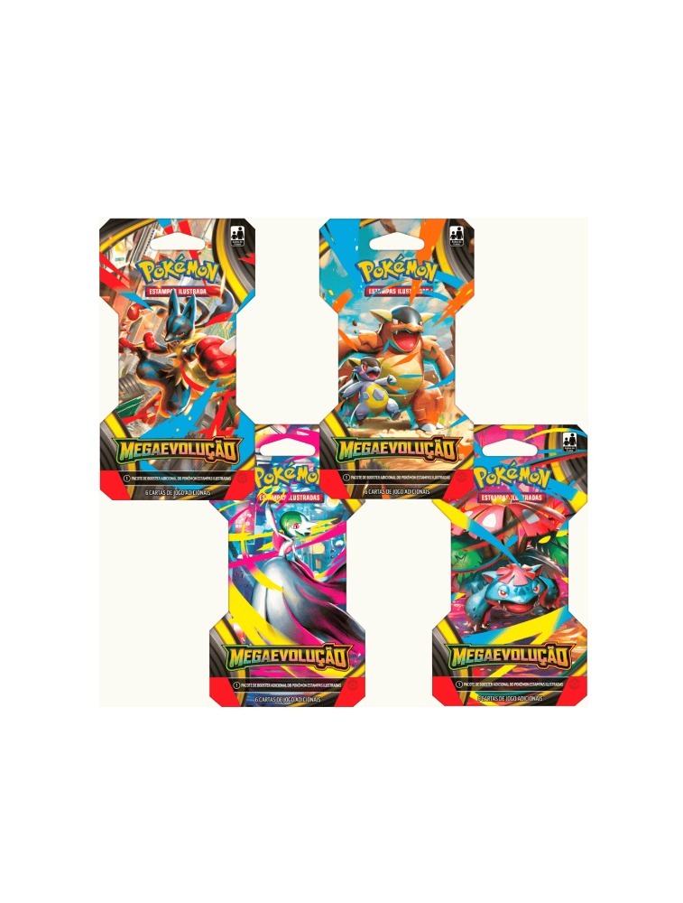 Cada embalagem vem em uma caixinha especial, trazendo 1 booster exclusivo com cartas aleatórias e a chance de encontrar os poderosos Pokémon de Mega Evolução.