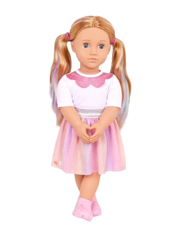 Conheça a Boneca Coralyn da Our Generation, a companheira perfeita para suas brincadeiras! Seus belos olhos violeta que abrem e fecham e seu longo cabelo com mechas multicoloridas, é perfeito para divertidos penteados! Coralyn chega vestindo uma saia colorida com cintura brilhante, uma blusa com gola adornada e adoráveis botinhas. Quando é hora de experimentar novos visuais, seu traje possui fechos fáceis para vestir e remover rapidamente. Isso permite que você misture, combine e crie seus looks favoritos com facilidade! Adquira a boneca Coralyn da Our Generation e embarque em aventuras inesquecíveis!
