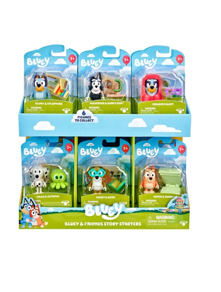 Junte-se a Bluey, Bingo e seus amigos enquanto eles se divertem imaginando e criando histórias Cada Starter Pack tem como tema um dos episódios de Bluey e vem com um acessório para o seu personagem brincar Também está incluído em cada pacote um mini cartão postal mostrando uma cena do programa de TV Bluey Todas as figuras nestes pacotes têm braços e corpo articulados.
