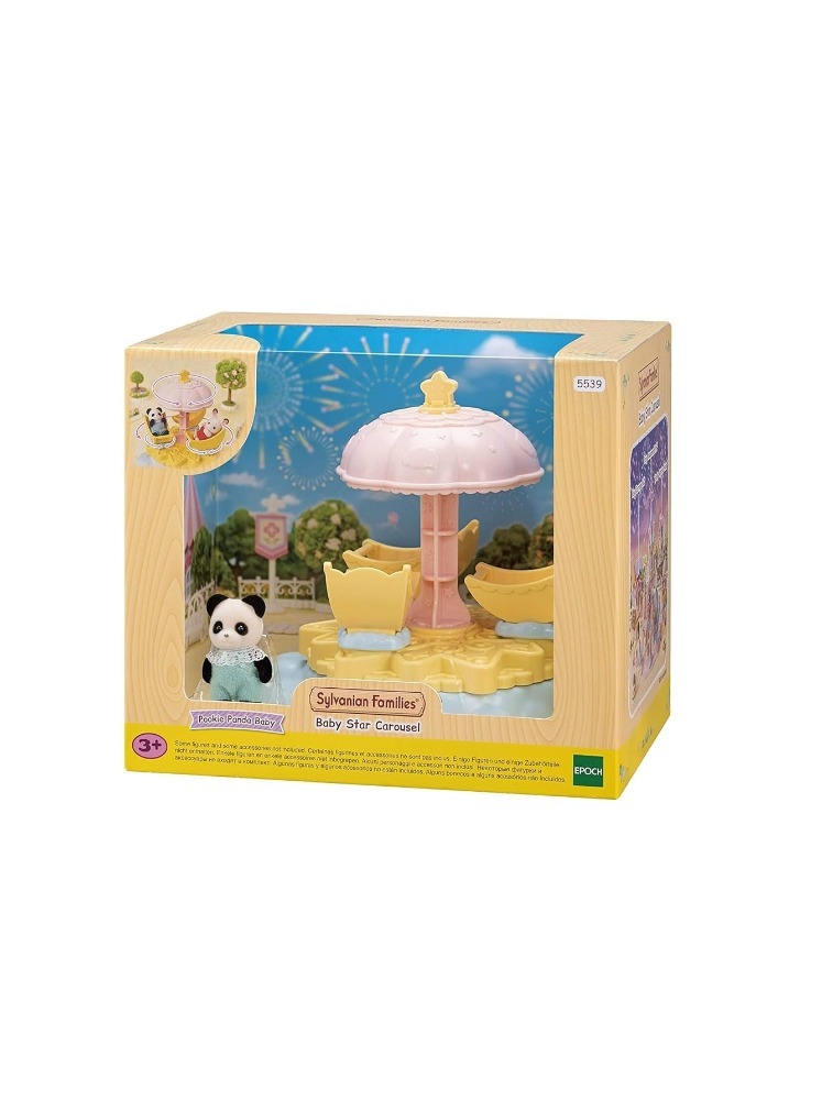 O Carrossel Estrela para Bebês tem assentos em forma de lua que giram ao redor ao girar o guarda-sol de estrela. Existem três assentos para as figuras de bebê se sentarem. Este conjunto vem com uma figura de Bebê Panda e pode-se brincar com ele sozinho.