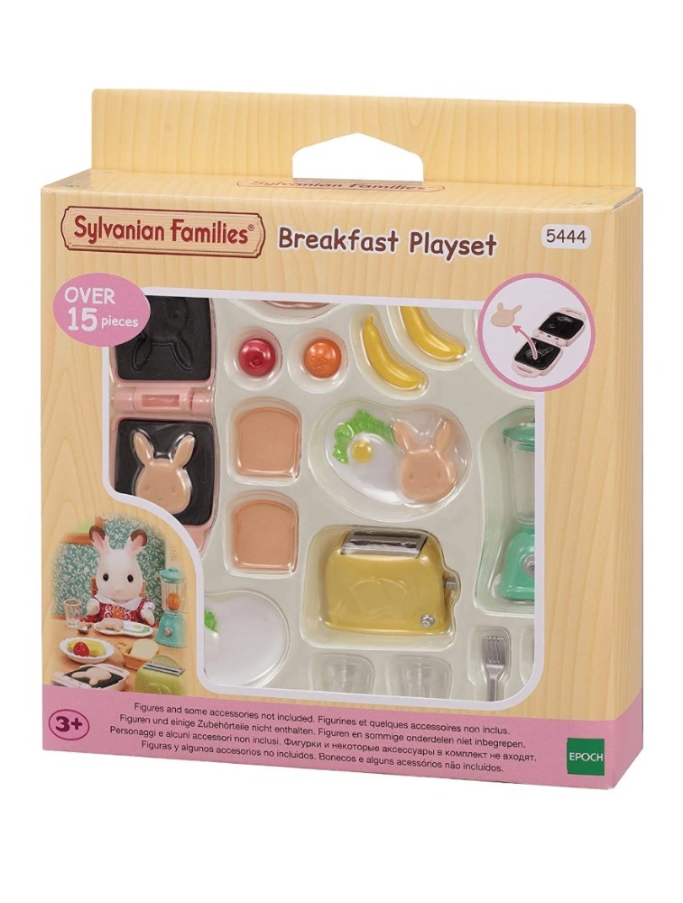Conjunto Café da Manhã inclui comidas parar o café da manhã e utensílios de cozinha. Inclui ovos fritos, pão e fruta. O pão pode ser colocado na torradeira pop-up. Faça uma torrada movendo a alavanca.