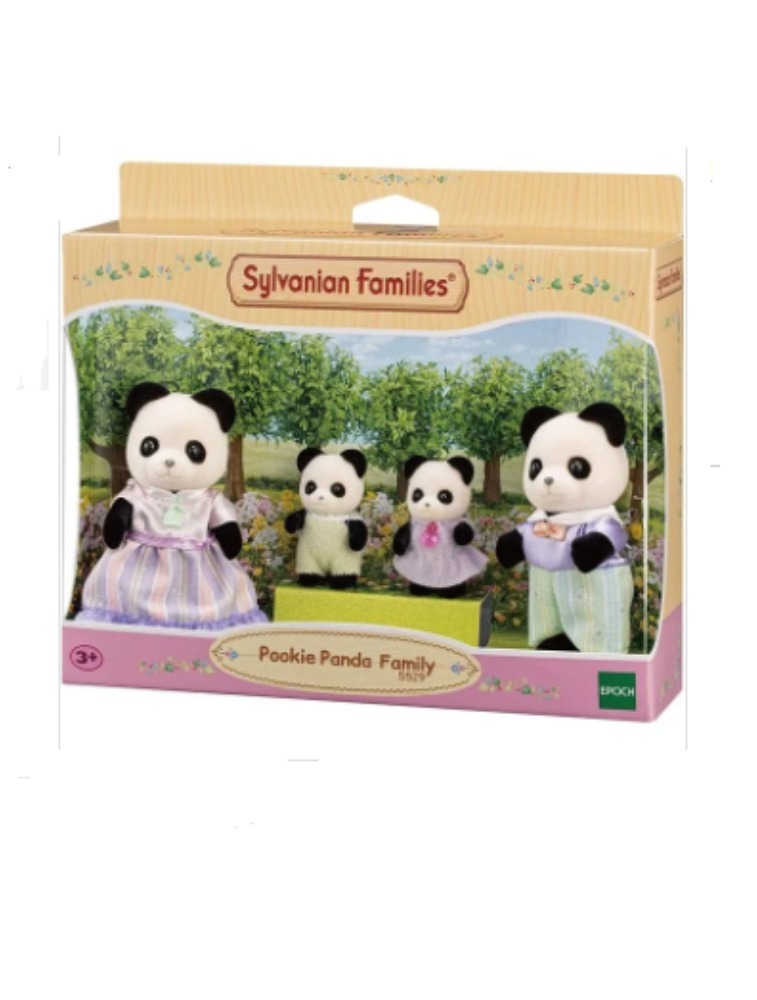 A Família Dos Pandas Graciosos aparece com roupas lindas e sonhadoras. Este conjunto inclui quatro figuras: pai, mãe e dois bebês.
