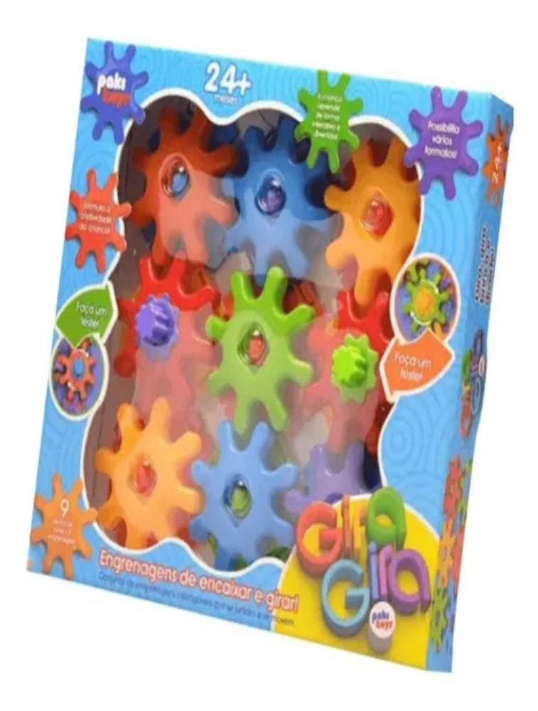 O Gira Gira é um brinquedo educativo que estimula coordenação motora, raciocínio lógico e percepção visual. Composto por 9 peças coloridas, cada uma com encaixes específicos, as crianças podem girar, empilhar e combinar as peças de diferentes maneiras, desenvolvendo criatividade e concentração enquanto brincam.