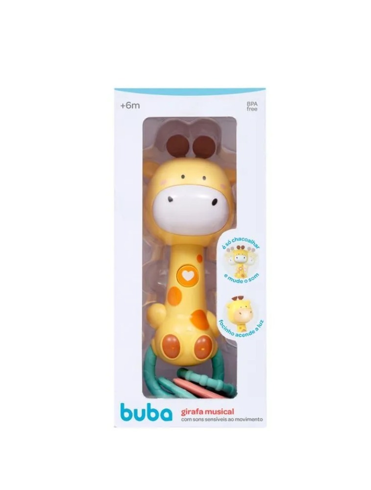 O pequeno vai descobrir diferentes ritmos e sons de animais com a Girafa Musical da Buba. Sensível ao movimento, é só chacoalhar para criar o próprio ritmo.