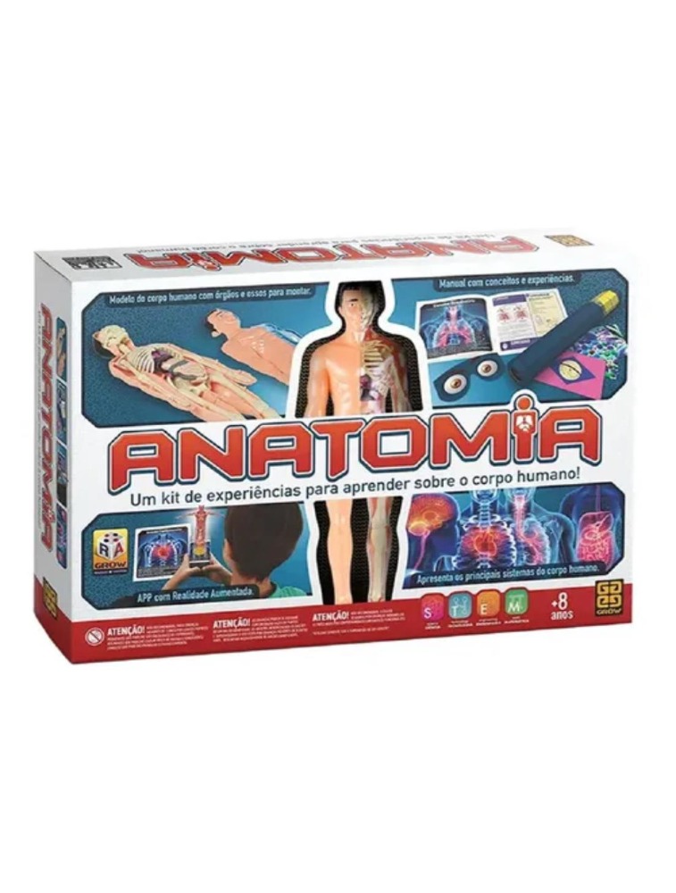 Um kit de experiências para aprender sobre o corpo humano! Inspirado na metodologia STEM, sigla em inglès para Science, Technology, Engineering and Mathematics (Ciência, Tecnologia, Engenharia e Matemática, em português), o ANATOMIA é um kit diversas experiências para divertir os jovens cientistas e facilitar o aprendizado de conceitos relacionados ao corpo humano e seus principais sistemas: cardiovascular, respiratório, nervoso, digestório, urinário e esquelético. Atrações principais kit traz uma maquete ou modelo miniatura do corpo humano com vários órgãos e ossos para montar e desmontar, um modelo de espirômetro para brincar de medir a capacidade dos pulmões e diversos componentes para realizar atividades que ajudarão entender: como funciona o processo de respiração, os movimentos do coração, os 5 sentidos, a importância dos rins e muito mais. Além disso, o kit incorpora a tecnologia da realidade aumentada para que você possa visualizar, através do seu celular, os principais sistemas e órgãos em 3D e aumentar ainda mais a interação e o interesse sobre a Anatomia humana! Desperte o biólogo... o médico... o cientista que existe dentro de você com este produto incrível.