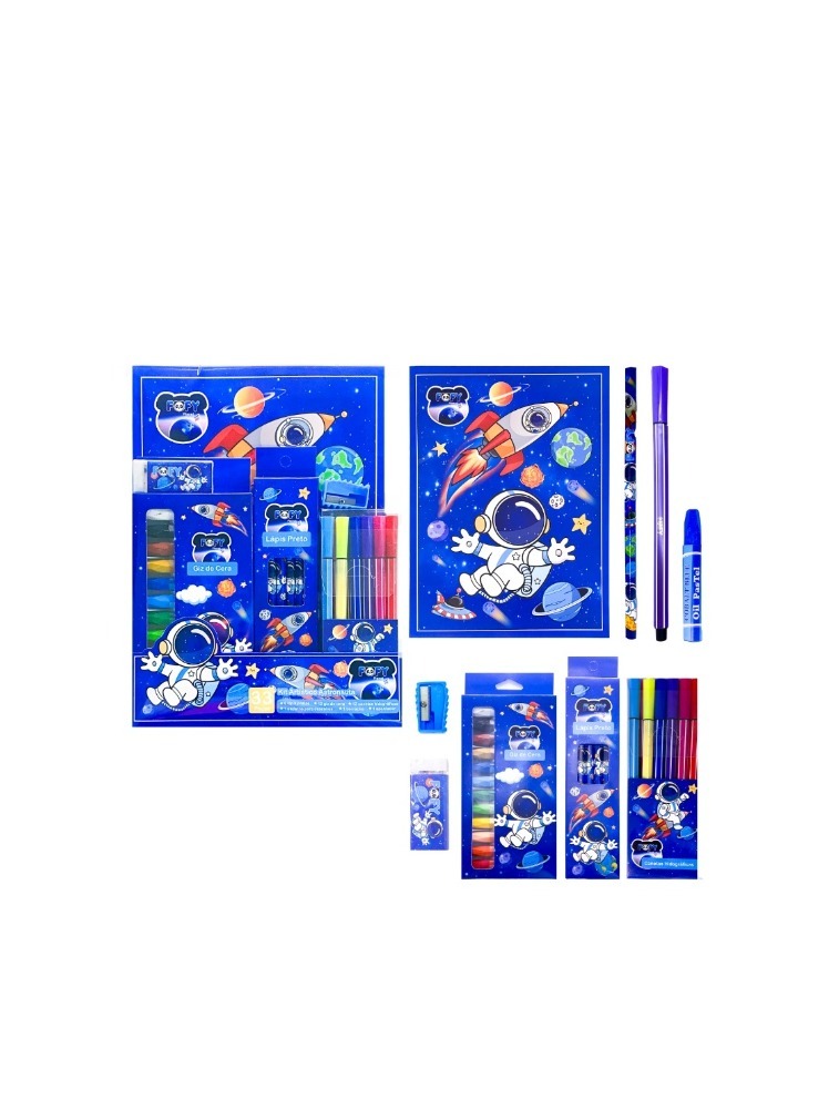 O kit artístico é ideal para criar e colorir. Contém 6 lápis pretos, 12 giz de cera, 12 canetas hidrográficas, 1 apontador sem depósito, 1 borracha e 1 caderno para desenhos com 12 folhas lisas brancas.