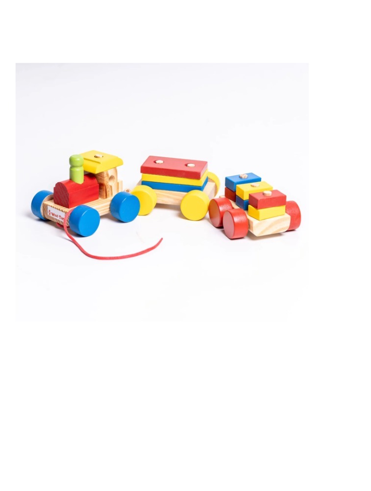 Trem composto por 1 locomotiva e 2 vagões com peças geométricas coloridas que encaixam nos pinos. Estimula a coordenação motora e visual, orientação espacial e discriminação de cores.