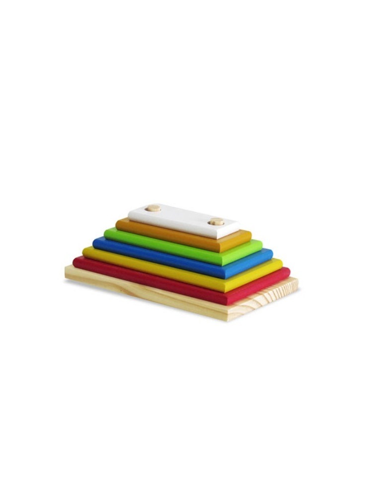 Pirâmide com 8 peças coloridas de tamanhos diferentes. Permite que a criança encaixe as peças no pino em ordem crescente ou decrescente. Estimula a coordenação motora e visual, discriminação de cores e quantidades e noção de tamanho.