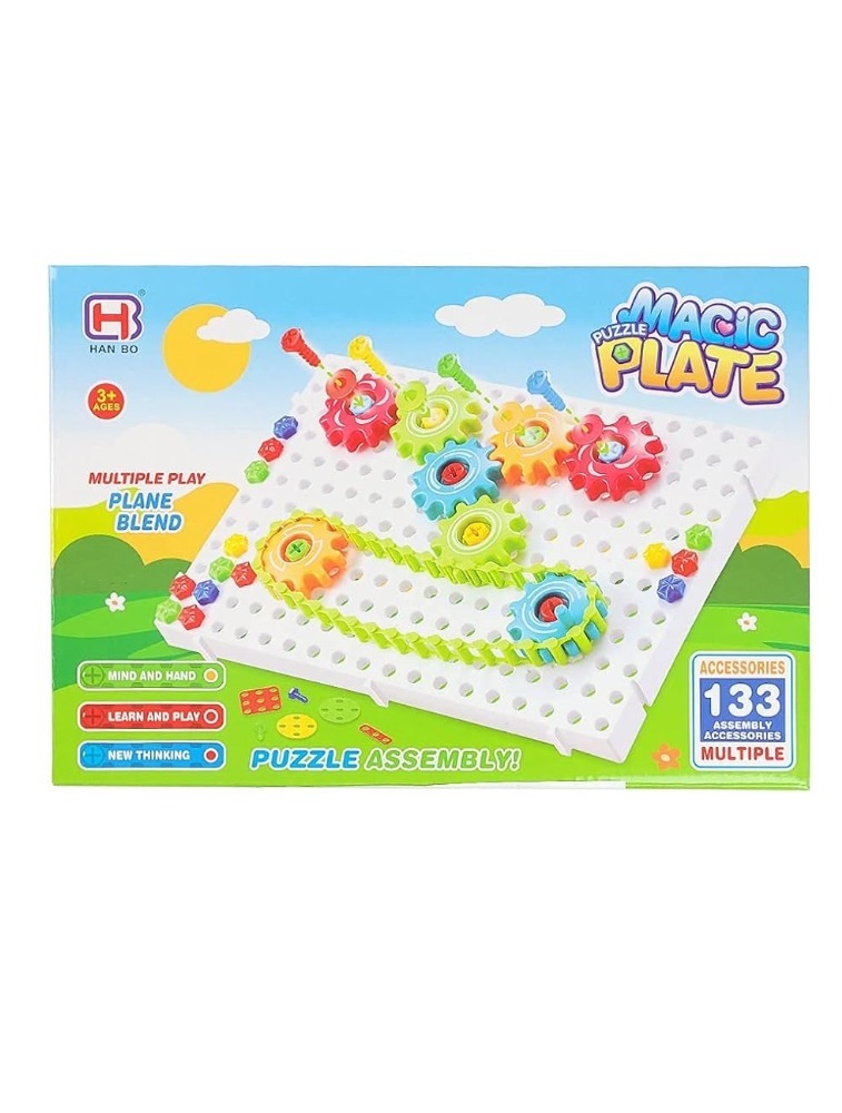 Puzzle Toys Magic Plate 133 pcs é um brinquedo divertido e inovador, que estimula a criação de cenários novos, com peças dinâmicas e multifuncionais, acompanha uma placa para montagem que pode ser anexadas a outras placas do mesmo modelo e ferramentas de brinquedo.