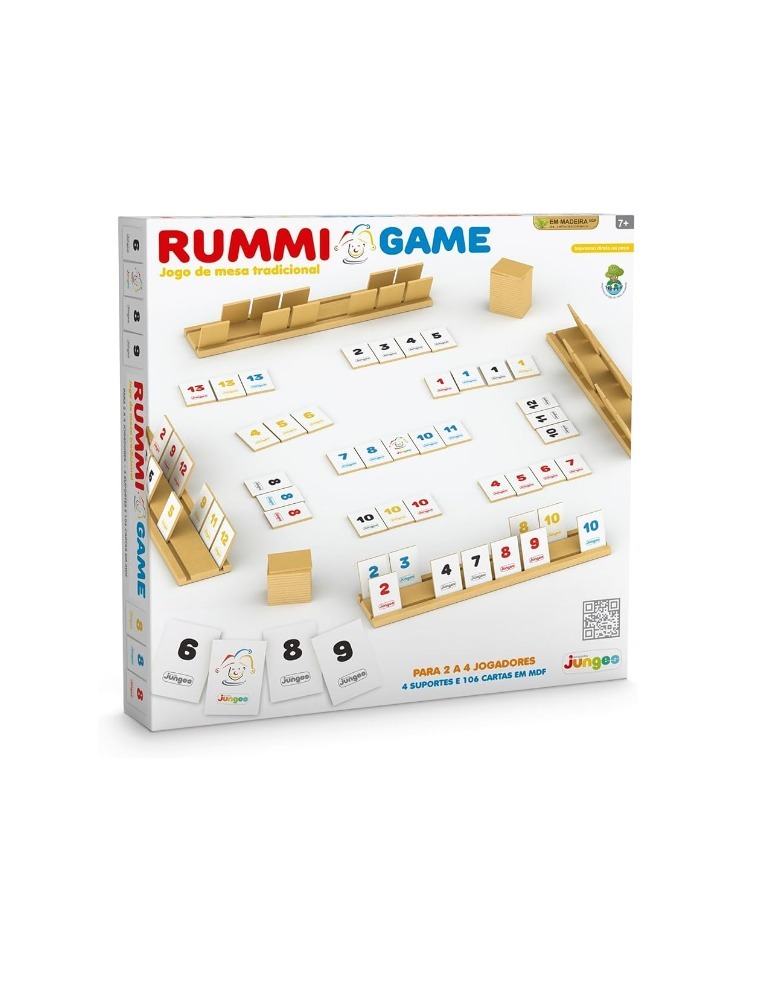 Rummi Game da Junges é um jogo tradicional de sequência numérica, com 4 suportes e 106 cartas em madeira de reflorestamento (MDF) impressas diretamente na peça. Para 2 a 4 jogadores.