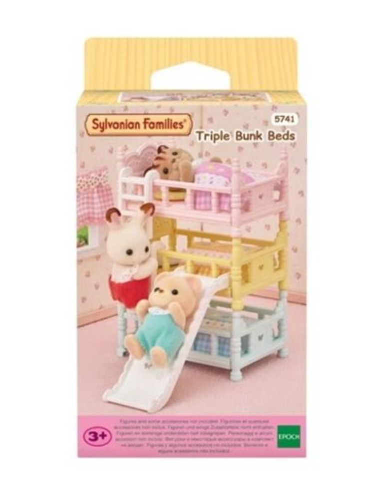 Conjunto de móveis com três beliches para bebês, com escadas e um escorregador.